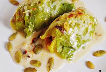 Colocar en una fuente un poco de esa salsa bechamel, encima los rollitos, queso rallado y un poco más de la salsa. Gratinar hasta dorar. Servir con pipas de calabaza y acompañando a la mesa de la salsa bechamel aromatizada en salsera aparte.