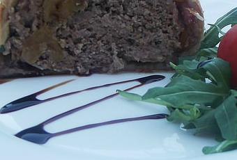 Estiramos el hojaldre, cortamos unas tiras por los bordes y las reservamos para decorar. Sobre el hojaldre, justo en el centro, colocamos el albondigón que teníamos en el frigorífico, encima le ponemos la cebolla caramelizada con el bacon y terminamos con el queso. Cerramos todo como si fuera un paquete, lo sellamos bien para que no salgan los jugos de la carne y adornamos con las tiras que habíamos reservado. Pintamos toda la superficie con huevo batido.