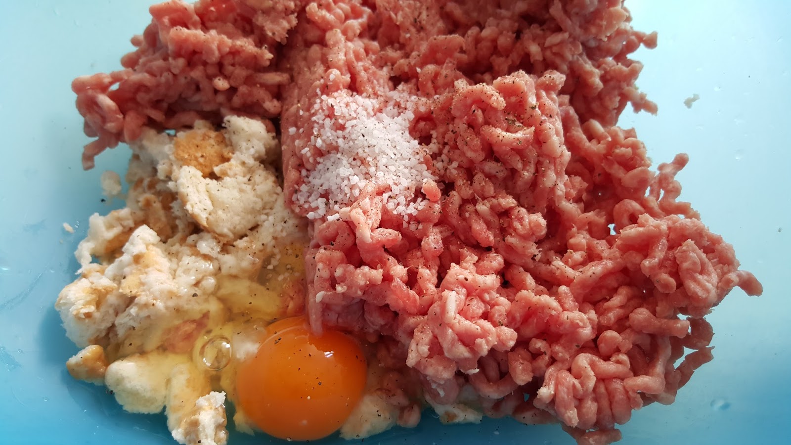 750 gr de carne picada (yo utilicé mitad cerdo y mitad ternera)4 rebanadas de pan de molde1 huevo100 gr de queso rallado (yo utilizo la mezcla de 4 quesos, sabrosísimo)una ciucharadita de salPimienta negra