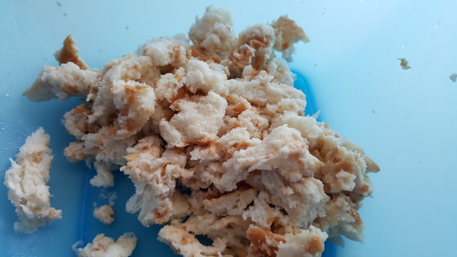 1. - Encendemos el horno a 180º. Humedecemos el pan con un poco de agua y lo desmenuzamos.