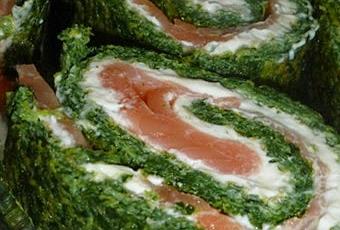 A los diez minutos, solamente que haya templado lo desenrollamos para rellenar. Vamos a preparar el relleno. En un cuenco mediano ponemos el queso y espolvoreamos eneldo seco. Mezclamos bien. Lo ponemos sobre el bizcocho salado y lo extendemos bien que quede uniforme. Encima ponemos el salmón ahumado que cubra toda la superficie pero tampoco que sea demasiado para que no resulte un bocado pesado.