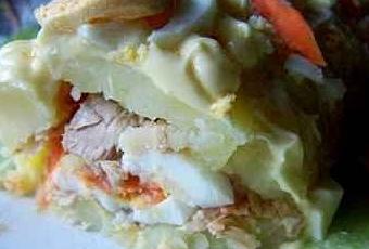 3 latas de atún en aceite1 zanahoria rallada100 grs. de aceitunas negras y verdes sin hueso1 tomate redondoMantecaSal y pimientaMayonesaPerejil picadoPreparaciónMezcla la zanahoria rallada con el atún, la mayonesa y las aceitunas. Reserva algunas para decorar el plato terminado. Condimenta según el gusto de los comensales.Por otra parte, haz un puré seco con las papas, con una cucharada de manteca y peregil picado. Entonces colócalo en un repasador, formando una base.Sobre la preparación de papa, coloca el relleno de atún y arorolla con la ayuda del trapo. Muy importante: deja enfriar en la heladera durante un mínimo de cuatro horas.Quita el trapo y coloca en una fuente. Decora con mayonesa, algunas aceitunas, ¡y listo! A disfrutar de este sabroso plato.