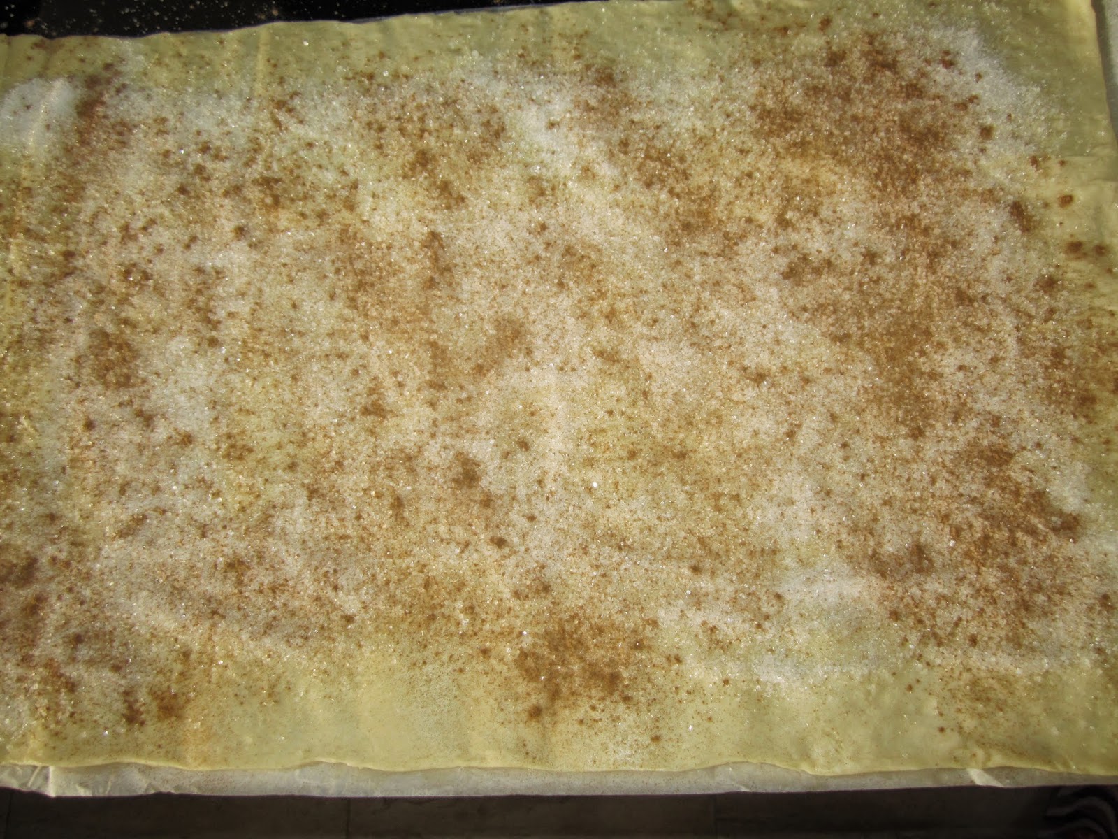 Desenrollamos la masa y ponemos una cantidad generosa de azúcar que la cubra y espolvoreamos con canela.