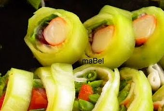 Todo un tema lo de los pepinos, en mi apoyo a los agricultores hice esta receta. Es una forma muy elegante de preparar la ensalada de siempre, pero presentada de otra forma. Le voy a mostrar 2 versiones, una como un canelón, y otra cortada como sushi.