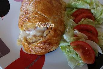 Ingredientes:2 láminas de hojaldre fresco rectangulares4 pechugas8 lonchas de jamón de york8 lonchas de queso1 huevosalpopurri de pimientasmostaza
