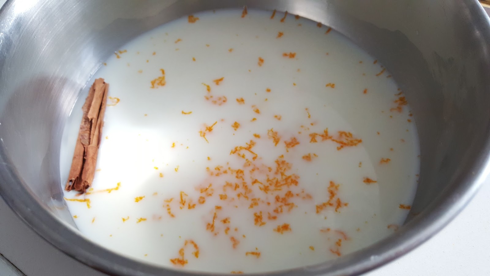 9 rebanadas de pan de moldeLa crema de naranja anterior100 ml de leche1/2 cucharadita de ralladura de naranja10 gr de azúcar1 rama de canela1 un huevoAzúcar y canela para rebozarlos