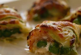 Una receta sencilla, sana y fácil que puedes realizar en poco tiempo.Ingredientes: Para 2 rollos grandes ó 4 pequeños1 calabacín mediano2 rodajas de queso de cabra (de rulo)8 espárragos verdes congelados1 tomate pequeño3 lonchas de jamón serrano ( he usado uno de cebo ibérico)Queso rallado mozzarella2 lonchas de salmón ahumadoAceite de oliva extra.Preparación: