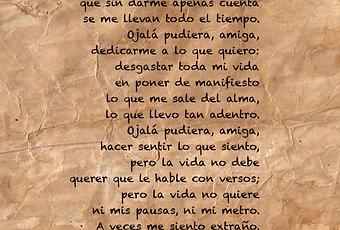 @mesientoensoledadA veces me siento extraño, siento a veces que no siento,en ocasiones me absorben las tareas que detesto que sin darme apenas cuenta se me llevan todo el tiempo. Ojalá pudiera, amiga, dedicarme a lo que quiero: desgastar toda mi vidaen poner de manifiestolo que me sale del alma,lo que llevo tan adentro. Ojalá pudiera, amiga, hacer sentir lo que siento, pero la vida no debe querer que le hable con versos; pero la vida no quiereni mis pausas, ni mi metro. A veces me siento extraño, siento a veces que no siento, que la vida se me pasa que quedan atrás los sueños; y antes de que me dé cuenta se habrá acabado mi tiempo.