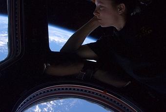 La astronauta Tracy Caldwell Dyson reflexiona con la vista de la Tierra desde la ISS. Crédito de la imagen: Doug Wheelock/NASA.