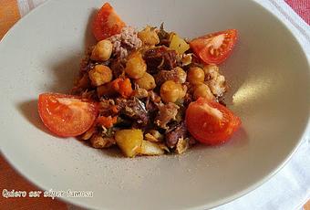 Hoy he querido hacer un refrito sencillo con los restos del cocido y las sobras de un plato de judias verdes y patata, que bien podría ser una variedad de otro plato muy popular llamado "ropa vieja".