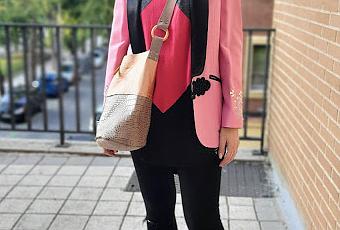La chaqueta es de La Condesa, camiseta de Pitágora, bolso cubo de Tándem y pendientes 3D Exploradoras de Chuic.