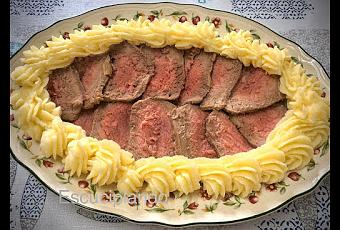 Cortamos finas lonchas de carne y las servimos con el puré de patatas. Como remate, añadiremos una cucharada de la salsa por encima de los filetes.