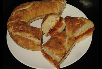 Cogéis el pan y lo abrís por la mitad. En la mitad de la rosca, echáis una capa de tomate, mejor si es casero y colocáis encima el chorizo, que soltará en el horno toda la grasa y eso hará que la rosca esté más jugosas, colocáis encima el jamón serrano y finalmente el queso, uno que se funda bien.