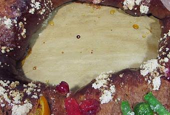 Dejamos levar hasta que doble el volumen, pintamos con huevo batido y decoramos con las frutas escarchadas y el azúcar humedecido con algo de brandy.