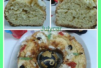 10 gr de ron con miel opcionalPara Decorar el Roscón:Frutas escarchadas. Azúcar humedecida. Almendras fileteadasPreparación:1º hacer la masa de arranque: En la Mycook ponemos todos los ingredientes de la masa de arranque y mezclamos 2 minutos, velocidad 3. Dejamos reposar toda la noche en un bol tapado con un paño (se puede dejar varias horas, pero sale mas bueno dejando que fermente toda la noche)Se puede amasar en la panificadora masa de arranque en programa amasado (15 minutos) dejar toda la noche y al día siguiente, añadir el esto de los ingredientes del roscón y amasar (15 minutos), o a mano2º Al día siguiente preparamos la masa del Roscón: 1º Triturar junto el azúcar las cascaras de piel sin nada blanco para que no amargue, velocidad 7/10 un minuto, por el bocal añadimos los huevos, la sal, el agua de azahar, la mantequilla y mezclar unos segundos, velocidad 5, poner la paleta mezcladora y añadir, la harina y la masa madre, amasar en velocidad espiga, 4 minutos, sacar la masa con las manos engrasas con aceite, dejar reposar hasta que doblen su volumen en un bol tapado con un paño, una doblado su volumen, dividimos la masa en dos partes iguales (si no queréis hacer dos roscones, la masa se puede congelar en film transparente y sacar cuando queramos hornearlo)pincelar la cubeta de la GM E con aceite ó poner la base de silicona ó papel de horno, nos untamos las manos con aceite de oliva y damos forma redondeada, hacemos un agujero en medio, metemos la masa dentro de la cubeta y en medio un aro para que no se cierre el agujero, dejar que doble otra vez su volumen, una vez doblado pintamos con huevo batido, ponemos las frutas escarchadas, el azúcar humedecido con agua y las almendras fileteadas, tapar con tapa doradora 150º, 15 minutos, olla menú horno 160º, 25 minutos, trabajan las dos juntas, dejar enfriar y desmoldear En el horno a 200º 25 minutos