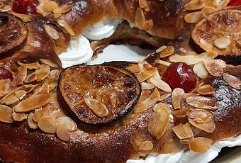 Partir el roscón la mitad para rellenarlo. Decorar la mitad inferior del roscón con la nata montada hasta cubrir toda la superficie.