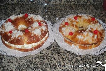 Lo primero es elaborar la masa madre, para ello templamos la leche y diluimos en ella la levadura, añadimos el azúcar y la harina y amasamos hasta obtener una bola. Metemos la bola en un bol con agua templada y esperamos unos minutos hasta que flote. Retiramos del agua y reservamos.Para preparar la masa, en un bol amplio tamizamos la harina, le añadimos la levadura fresca deshecha en la leche tibia, los huevos, el azúcar, la mantequilla y las ralladuras de limón y de naranja. Amasamos y colocamos sobre la encimera de la cocina untada con aceite. También debemos aceitarnos las manos para que no se nos pegue la masa. Continuamos amasando hasta obtener una masa elástica. Formamos una bola y la colocamos dentro de un bol tapado con un paño hasta que doble su tamaño, unas cinco horas.Pasado el tiempo de levado vamos a darle forma al roscón, podemos hacer uno de tamaño grande o dos más pequeños. Yo preferí hacer dos pequeños, para ello dividí la masa en dos partes; vamos haciendo un agujero en el centro separando la masa con los dedos. Si vemos que la masa se encoge la dejamos reposar unos cinco minutos y nos resultará más fácil de manejar.Colocamos los roscones sobre una fuente de horno forrado con papel de horno y esperamos unas dos horas hasta que vuelvan a doblar el volumen.Ahora es el momento de decorarlos, pincelamos la superficie con huevo batido con mucho cuidado de no pincharlo y por encima colocamos montoncitos de azúcar mojado en un poco de agua, las guindas confitadas y la almendra.Precalentamos el horno a 180º y horneamos durante unos veinte minutos. Una vez horneados los dejamos enfriar sobre una rejilla y los cortamos longitudinalmente para rellenarlos.Uno de los roscones lo rellené de nata. Montamos la nata bien fría con el azúcar, la colocamos en una manga pastelera y vamos poniendo unos moñetes sobre el roscón. Tapamos con la otra mitad.