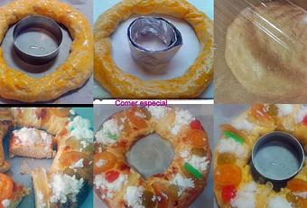 DECORACIÓN: Batir una yema de huevo, pintar el roscón. Espolvorear con azúcar humedecido y añadir fruta confitada.