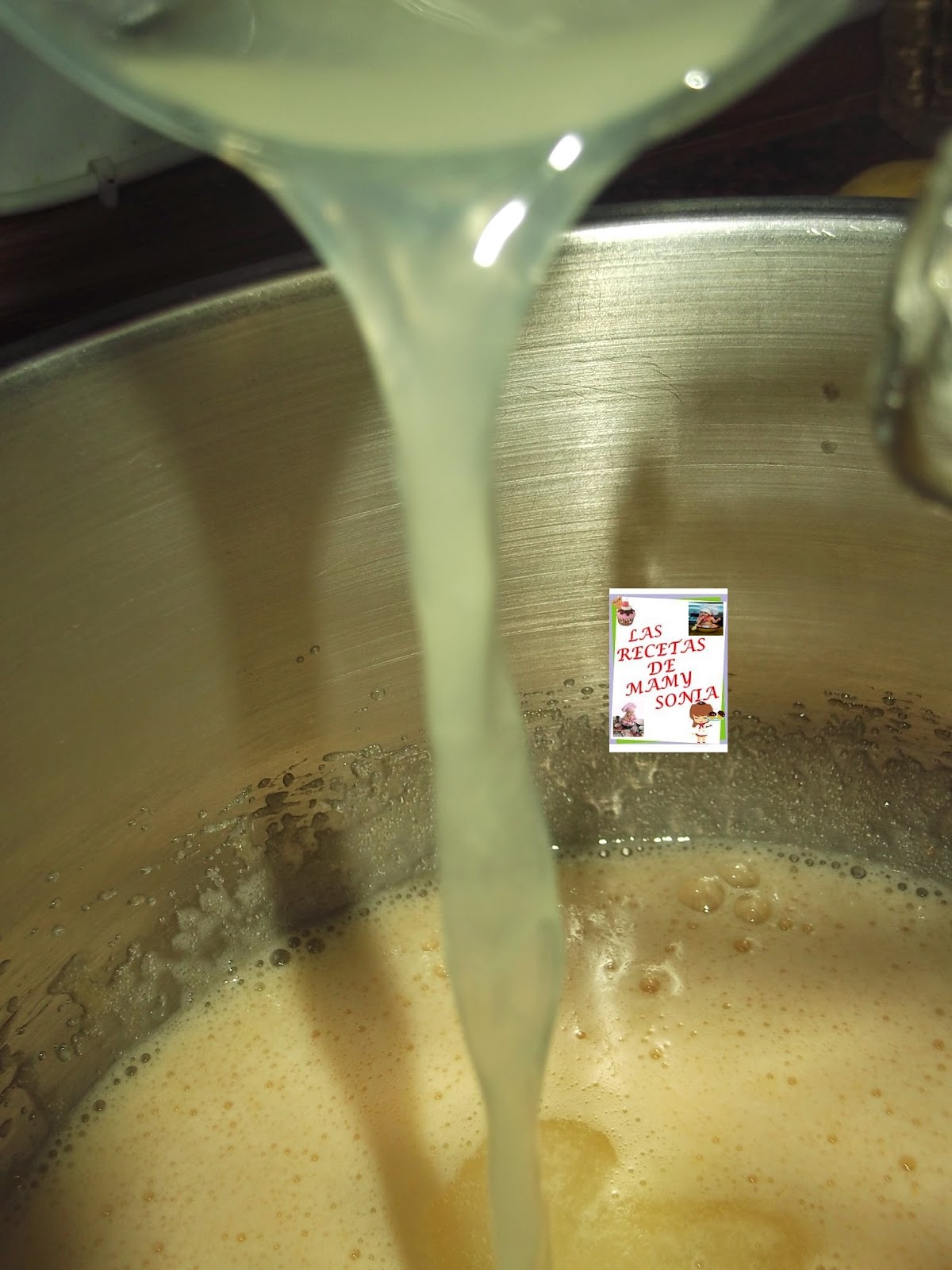 Agregamos el zumo de limón, la copita de anís y el aceite templado y batimos
