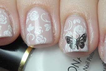 Usé los discos: M65, para el fondo de rositas que adoro! y M39 para el detalle de la mariposita.De color de base usé My very first knockwurst, y para estampar el blanco de konad, y un negro de amodil, truchito pero que estampa hermoso!