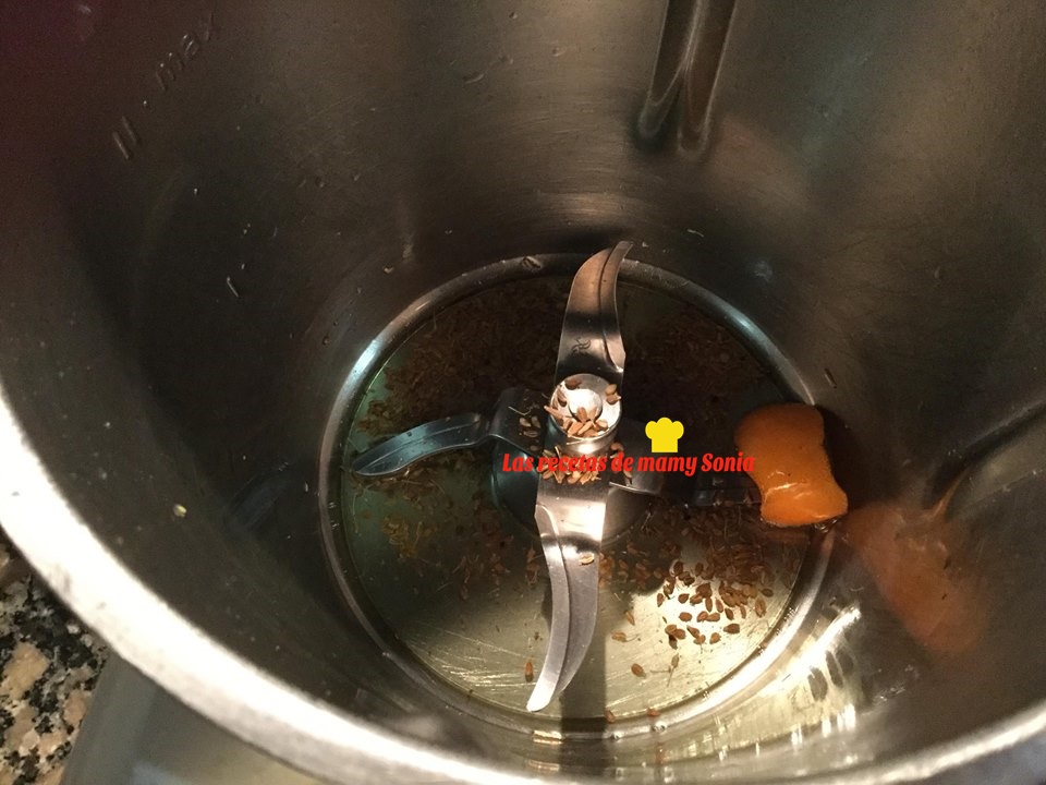 THERMOMIXPonemos el aceite y la piel del limón en el vaso de nuestra Thermomix y programamos 5 Min, Varoma, Vel 1. Cuando quede un minuto para terminar agregamos la matalahuga por el vocal.