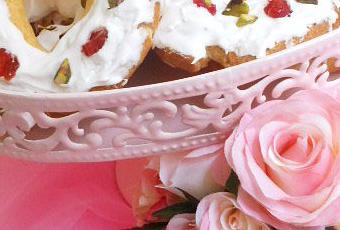 Montamos la media clara a punto de nieve y le vamos añadiendo azúcar glas a tandas, hasta que esté completamente integrado. Repetimos la operación anterior, cogemos las rosquillas de una en una y las bañamos hasta la mitad en el glaseado. La secamos unos minutos al horno hasta que el merengue quede seco y decoramos con cerezas y pistachos.