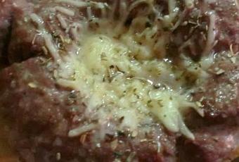 Cogemos una fuente resistente al horno, colocamos las patatas en el fondo, ponemos los roscas de carne encima, echamos queso rallado en el centro y rociamos con aceite de oliva.