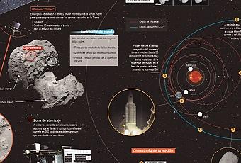 La misión Rosetta, una sonda espacial que ha concluido un viaje de diez años por el Sistema Solar hasta llegar al cometa en el que tiene previsto aterrizar el próximo 11 de noviembre, ha fijado el punto del astro 67/P Churyumov-Gerasimenko donde espera posarse sin incidencias. Se ha determinado para ello un punto llamado “punto J” de un kilómetro cuadrado, y se encuentra en la parte superior del cometa. El aterrizaje requerirá unas siete horas para desarrollar una delicada operación inédita hasta ahora en la historia de la exploración espacial pues se trata de la primera vez que un ingenio construido por el hombre tomará tierra en un cometa, que vuela a unos 440 millones de kilómetros del planeta azul. Una vez Philae (el módulo de aterrizaje) haya abandonado la sonda Rosetta, el módulo aterrizará de manera autónoma, siguiendo las instrucciones que le hayan enviado desde el centro de control en la Tierra antes de la separación y tomando imágenes durante su descenso. Rosetta lleva diez años viajando por el espacio desde que fue lanzada en el año 2004 y en ese tiempo ha recorrido grrandes distancias en su odisea para tratar de obtener respuestas sobre el origen del Sistema Solar. Fuente: EFEFUTURO Foto: Imagen del cometa 67P/Churyumov-Gerasimenko captada por Rosetta el pasado 5 de septiembre. ESA
