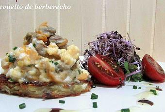 - Lo montamos en un plato pondremos un rösti en el centro del plato y pondremos una cuarta parte del revuelto encima del rösti.
