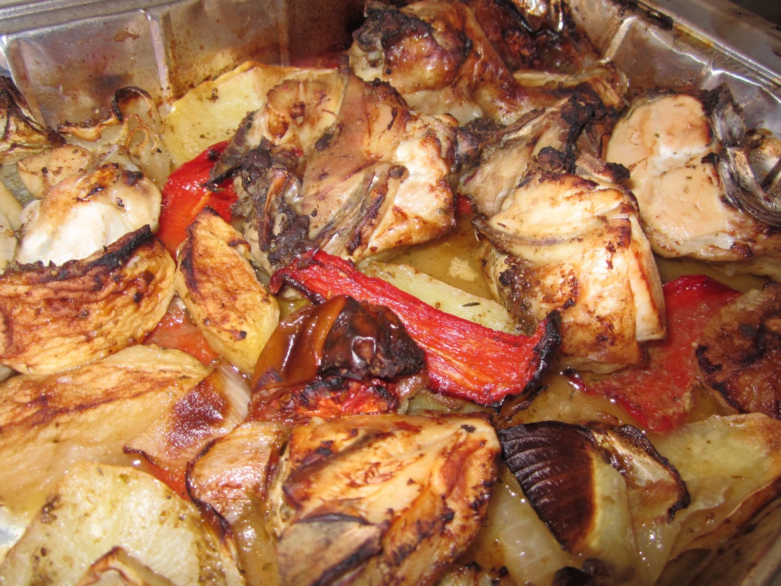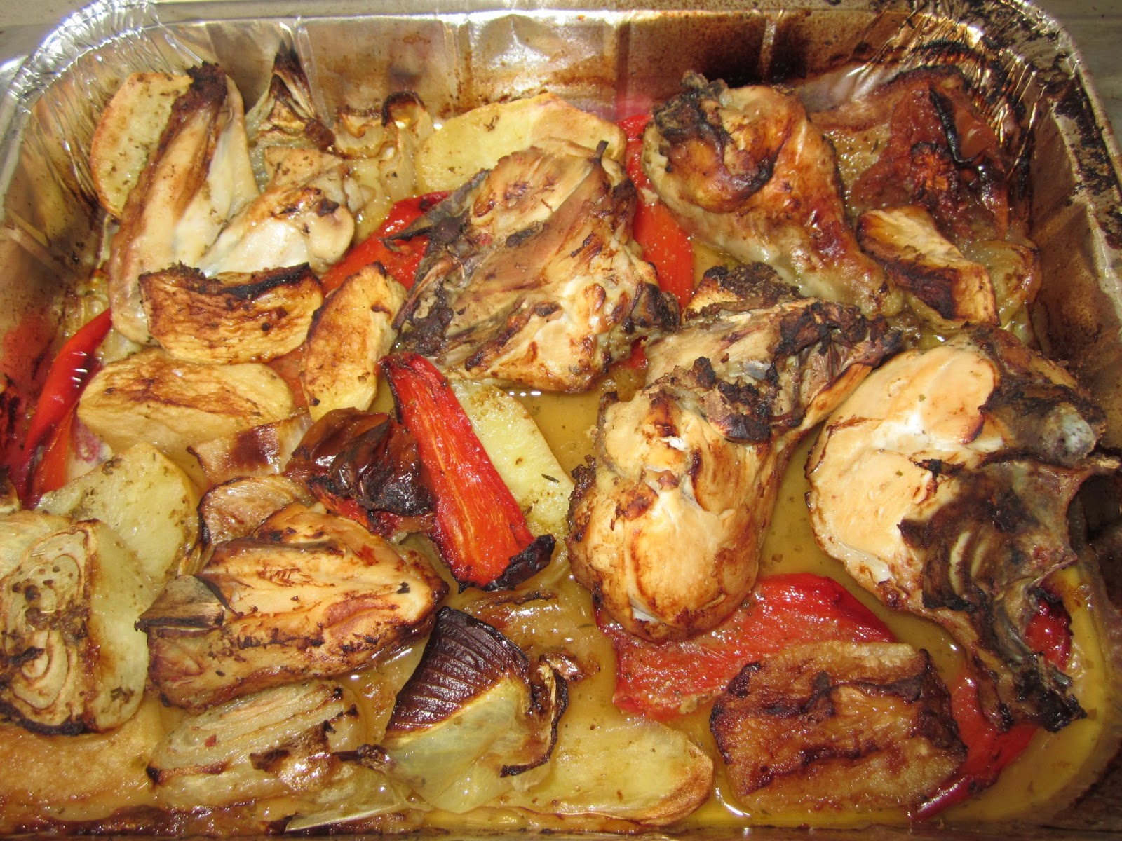 INGREDIENTES:- Medio pollo troceado a trozos grandes.- Una cebolla.- Un tomate.- Medio pimiento rojo a tiras anchas.- Una patata a rodajas.- Dos manzanas peladas y cortadas a octavos.- Orégano - Medio limón.- Aceite y sal - Vino blanco.