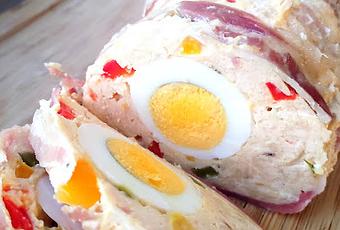 - Sobre papel de plata extiende las lonchas de bacon , extiende la carne, coloca los huevos cocidos y forma un rollo con la pechuga. Extiende por encima el bacon que está debajo.