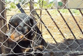 Lleva toda su corta vida atado en un campo con una corta cadena, como vereis en las fotos no se puede mover mucho, su caseta es un bidón, en invierno mucho frio y en vereno el calor tambien y el bebedero si es grande, es un bidón cortado lleno de agua verde y sucia y comedero no tiene, por que no le dan de comer excepto mi cuñado que es el que le esta dando a través de la malla.
