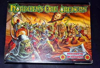 Este fue el tercer regimiento de renombre que compré. Los Harboth's Orc Archers de referencia RR3. Estos orcos fueron diseñados por Kevin Adams. La portada de la caja creo que fue obra de Angus Fieldhouse (también fue el ilustrados de la portada de la Warhamemr Armies de la tercera edición). Este regimiento fue anunciado en el número 90 de la edición inglesa de la revista White Dwarf de Junio de 1987 para la segunda edición de Warhammer Fantasy Battle (quedaban 5 meses para que saliera la tercera).