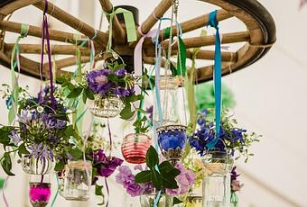 Lo ideal, para mí, son esas grandes ruedas de carro que os decía, pero es verdad que son difíciles de transportar, pesan un horror y tampoco es fácil encontrarlas. Así que vamos a ponernos en pequeña escala y voy a enseñaros algunas cosas que he visto usando ruedas de bici. Más grandes o más pequeñas, también quedan ideales. Si se ponen varias de distintos tamaños quedaría un montaje de seating plan súper chulo si se acompaña con un fondo de madera y hojas verdes como os decía en este post. También me encantan como “candelabro” suspendido, con flores, botes, velas…