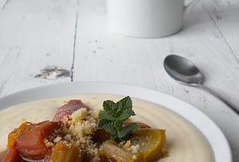 A la hora de servir, majamos en el mortero las shortbreads, creando un crumble crujiente, y listo para espolvorear por encima vuestro postre de ruibarbo con crema pastelera casera.