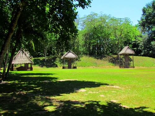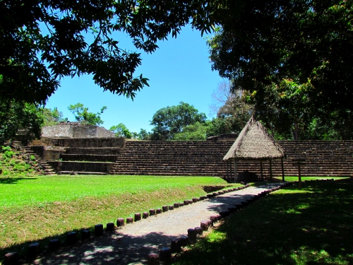 Plaza de juego de pelota. El juego de pelota entre los mayas era además de un juego, un rito importante dentro de su cosmovisión, ya que la pelota representa el curso del sol sobre el cielo en su viaje diario, así como la batalla entre el bien y el mal. A la fecha las dos estructuras paralelas del juego de pelota están cubiertas por otras construcciones de la acrópolis.