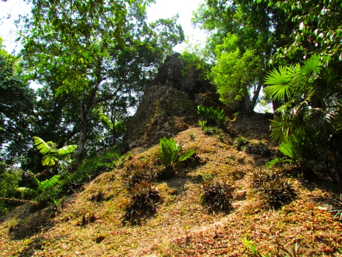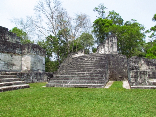 El Templo V. De 51 metros de altura. Cercano a la Acrópolis sur. El templo fue magníficamente restaurado con ayuda de la comunidad española. La parte posterior está cubierta por la vegetación lo que permite admirar el trabajo realizado.
