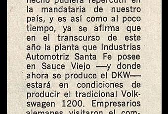 Según tenía entendido existieron presiones de Fiat Concórd directamente al gobierno de turno, presidencia de Arturo Illia, para que Volkswagenwerk AG (Aktiengesellschaft, sociedad anónima) no se instalara en Argentina. Y si lo hubieran hecho se habría concretado en la planta de IASF (Industria Automotriz Santa Fe SA), que tenía la licencia para producir los Auto Union 1000 S, que no eran otra cosa que automóviles de la marca alemana DKW.