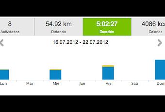 El total de kilómetros hechos esta semana, del 16 al 22 de julio, ha sido de 54.92 km a un ritmo medio de 5:16 min/km.