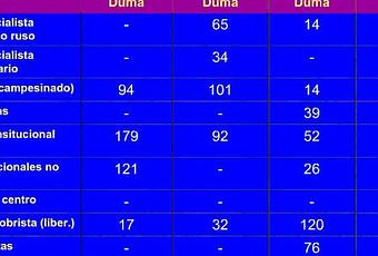 Al reunirse la Duma, el Partido Kadet exigió varios cambios: sufragio masculino universal, responsabilidad de los ministros ante la Duma, legislación agraria, desaparición del Consejo de Estado, amnistía... Los diputados campesinos pidieron un reparto de la propiedad de la tierra. La respuesta del Zar fue disolver la Duma dos meses después (el inspirador de esta medida fue el Ministro Stolypin). Muchos miembros del Partido Kadet tuvieron que abandonar el país.En 1.907, se eligió la segunda Duma. El Gobierno intento controlar las elecciones, a pesar de ello, socialistas Mencheviques y Socialrrevolucionarios participaron y obtuvieron más de 90 escaños. El Partido Kadet perdió muchos escaños y el Partido Octubrista mejoró muy poco. Esta Duma no era del agrado del Zar, había muchos diputados revolucionarios. El Zar decidió actuar y detuvo a 50 diputados tildados de revolucionarios y pidió a su ministro Stolypin que reformara el reglamento electoral. La Duma acabó a los seis meses. Si alguien había albergado el sueño de la existencia de una Duma democrática podía darlo por finalizado. Se eligió una tercera Duma (1907-1912) en la que se redujo drásticamente la presencia de los diputados de izquierda y un auge de los del Partido Octubrista que Stolypin quería fueran fieles cooperadores del Gobierno. Una Duma obediente a los deseos del Zar. En la cuarta Duma (1912-1916) se atomizó más el voto, pero la presencia de la izquierda revolucionaria siguió siendo muy pequeña.