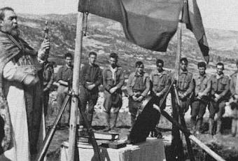 Popes venidos de otros lugares de Europa oficiaban misas por el rito ortodoxo para los rusos blancos que combatían en España. Se ven la bandera de la Rusia presoviética y la española