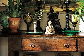 Es una casa rica, llena de detalles dispares, de fuerte personalidad, y con un marcado amor por la naturaleza, y por los elementos étnicos. Encontramos objetos indios, brasileños y americanos, todos de diferentes estilos y épocas. Así como muchas imágenes, estampas, de referencias botánicas...