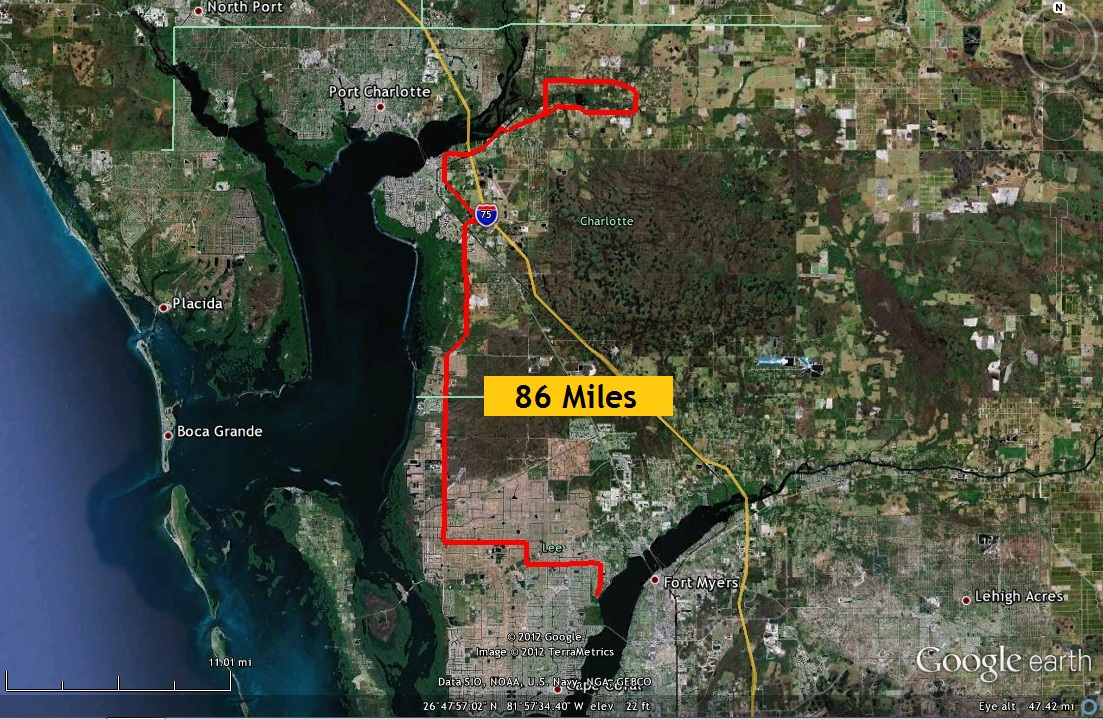 Cuando todo estalló, innumerables fueron las casas que quedaron abandonadas, en juicio hipotecario o incontables los terrenos que quedaron baldíos. En casi todos los sectores de la urbe hay espacios desocupados y en esta parte superan casi siempre a los que han sido construidos. Al ir a la derecha en Santa Barbara Blvd iremos en dirección norte por espacio de una milla y media, luego, giraremos a la izquierda en el Tropicana Parkway. Desde ahora en adelante, podremos comprobar de primera mano porqué en el pasado lustro, Cape Coral ha intentado independizarse de Lee County, creando su propio condado. Gran parte de las calles, que son magníficas para los automóviles, carecen de aceras, arcenes o carriles ciclables separados. Tampoco los típicos carteles de Share the Road, que avisan a los conductores de la obligación de compartir la carretera con los ciclistas, de acuerdo a las leyes estatales. Tras otras cinco millas, vamos a la derecha sobre la Burnt Store Road/County Road 765.