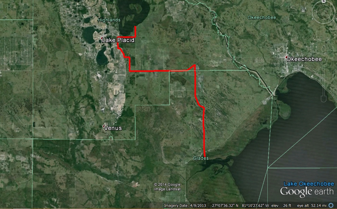 Por la Estecate Emencvnv Nene o Reservation Road, observaremos que las decenas de calles que cruzaremos vienen con señales escritas con los nombres nativos y debajo su traducción al inglés. También pasaremos junto al casino y a la vera de terrenos agrícolas y campos con ganado. De hecho, los Seminoles operan esta última industria con tal éxito que son la duodécima potencia del país. Al salir de la reserva el paisaje no cambiará mucho, cruzaremos el Indian Prairie Canal y contemplaremos las grandes parcelas de la compañía Lykes Brothers Inc, quienes han llegado a ser los mayores terratenientes del Sunshine State y los novenos en los EEUU. Antes de 1959, incluso poseyeron varios miles de acres en Cuba. Estamos de pleno una vez más en el Florida Heartland, una región rural compuesta por DeSoto, Highlands, Okeechobee, Hardee, Glades y Hendry, seis condados sin salida al mar. La población total es de unos 250.000 residentes. Nos hallamos lejos de las áreas metropolitanas en el auténtico Deep South o "Sur profundo" americano. Cerca de las 16 millas de travesía, dejaremos Glades atrás y pasaremos a Highlands County. Por espacio de otra milla, los arcenes desaparecerán por lo que sobre la bicicleta, debemos circular con extrema precaución. Afortunadamente, el tráfico no es muy denso.