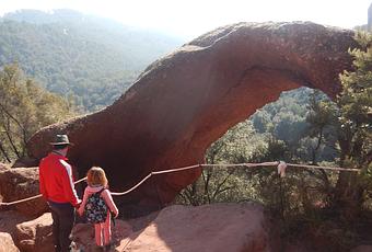 La Roca Foradada o arco natural de Bruguers marca el inicio de esta ruta. Se trata de un amplio tafoni, una estructura rocosa formada por arenas compactadas y esculpida por los agentes erosivos meteorológicos, especialmente el viento. A lo largo del tiempo, este viento ha incidido y erosionado la piedra de manera gradual, perforando la cavidad inicial en ambos lados y dando origen a la formación de este impresionante arco.