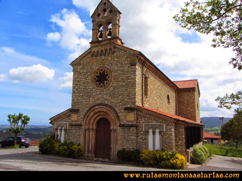 Iglesia de Huerces. A la derecha de esta imagen, saldría el camino en descenso por el que vamos, junto a una parada de bus.
