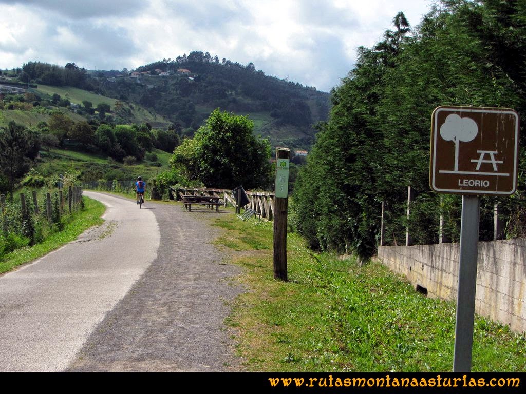 Fin de la Senda Verde de la Camocha. Nos vamos por la salida derecha a coger la carretera que nos lleva a Huerces