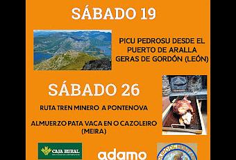 La segunda actividad del mes de octubre, será el sábado 26 , donde nos desplazaremos a la vecina provincia de Lugo, para realizar la ruta del Ferrocarril minero desde San Tirso de Abres a Pontenova y con el plato fuerte, de degustar, el tradicional almuerzo de la PATA DE VACA en O Cazoleiru de Meira.
