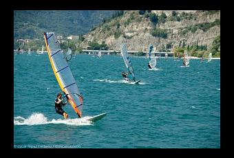Zona de vacaciones, windsurf, veraneo, repleto de restaurantes y terrazas donde los turistas, principalmente alemanes e italianos, pueden disfrutar de las fantásticas vistas del lago y de los apasionados del wind surf. Había decenas, recorriendo el lago en transversal, con los carabineri controlando que nadie se desmadre ni se cruce en la ruta de los ferrys que llevan turistas a recorrer el lago. Me senté en la orilla, cerca del embarcadero de los ferrys y de una pequeña playa. Allí estuve casi una hora tirando fotos hasta conseguir una que me gustara y creo que lo conseguí, no?