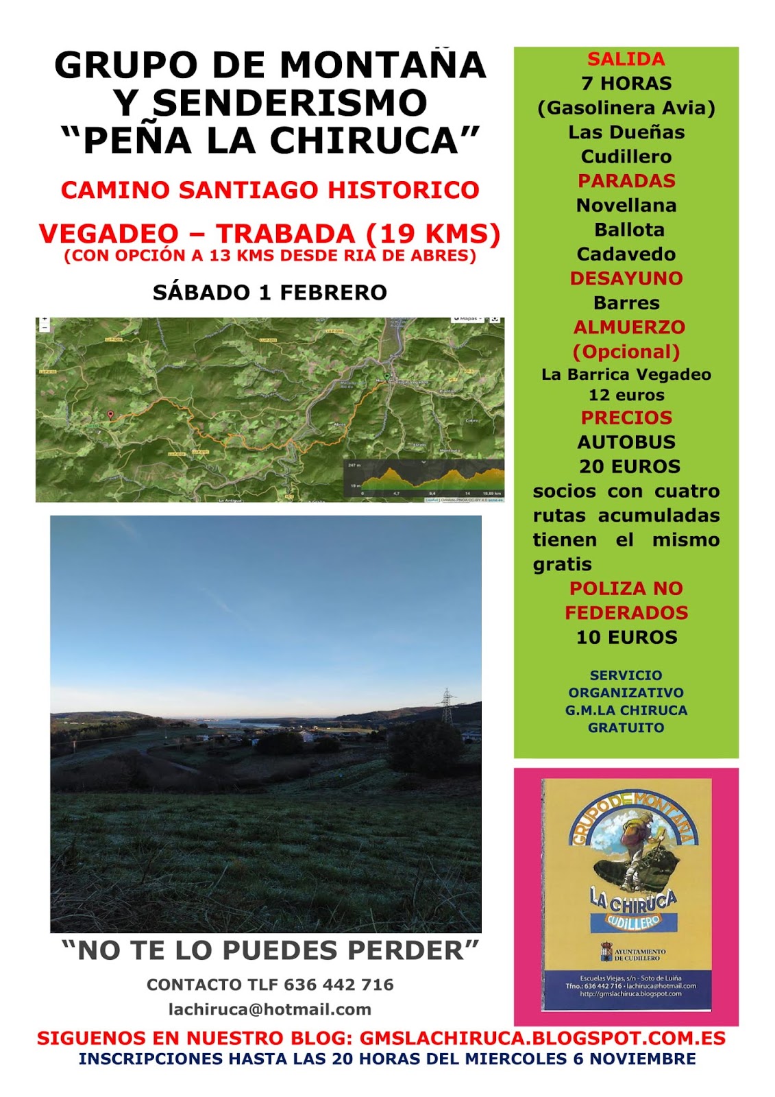 DATOS TECNICOS, PINCHA: AQUÍSERVICIO ORGANIZATIVO GRUPO CHIRUCA: GRATUITOPRECIO AUTOBÚS: 20 euros, socios con cuatro rutas realizadas, tienen el mismo gratis al hacer la quintaALMUERZO: (opcional) Meson La Barrica (Vegadeo) – 12 euros menúPOLIZA NO FEDERADOS NI CON SEGURO ACCIDENTES: 10 EUROS*(*Dependiendo número asistentes que tengan que hacer uso póliza, a partir de 8 personas pasa a 8 euros).ULTIMO DIA DE INSCRIPCIÓN: MIERCOLES 29 DE ENERO 20 HORAS EN EL TLF 636 442 716 E-MAIL: lachiruca@hotmail.com